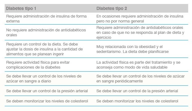 En cuanto al tratamiento de los dos tipos de diabetes podemos observar qué requiere cada uno de ellos en la siguiente tabla: